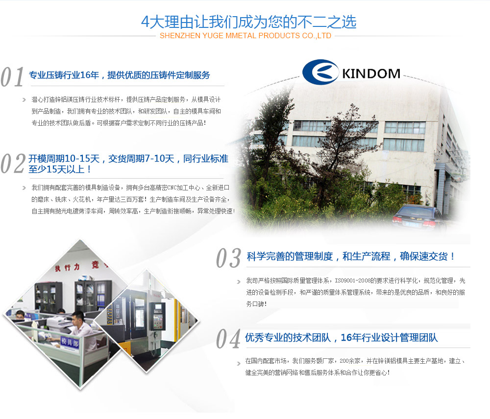 公司坐落在美麗的觀潮勝地海寧連行經(jīng)濟(jì)開發(fā)區(qū)內(nèi),距杭州18公里,緊靠杭州繞城高速(G2501)下沙出口,距江東汽車產(chǎn)業(yè)園10公里。公司占地面積33000平方米,廠房建筑面積15050平方米。擁有各種高低噸位的著名品牌壓鑄件15臺(其中800T壓鑄機(jī)2臺、500T壓鑄機(jī)2臺、280T壓鑄機(jī)5臺、135T壓鑄機(jī)6臺),還有高精密自動沖床、高精密度多軸鉆床、切邊機(jī)、表面處理等設(shè)備20余臺。公司擁有三坐標(biāo)測量儀、光譜分析儀、硬度拉力試驗(yàn)機(jī)等精密計(jì)量檢測設(shè)備。